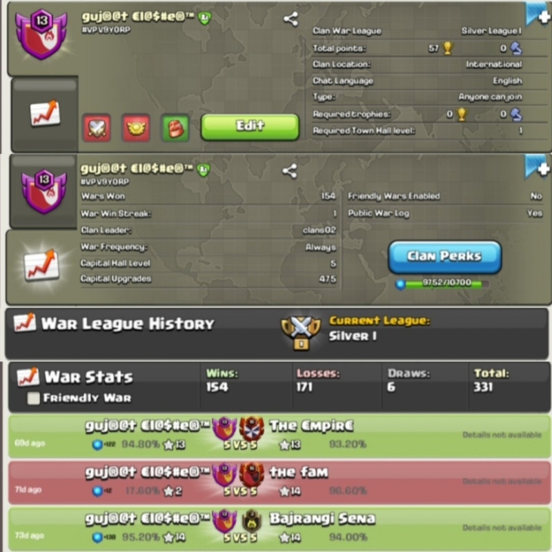 🟥⬛🛑Clan Level 13🛑⚫ Silver 1🛑⚫Clan Capital 5🛑⚫ WIN- 154/ LOSS- 171🛑⚫ Fast Delivery🛑⬛🟥