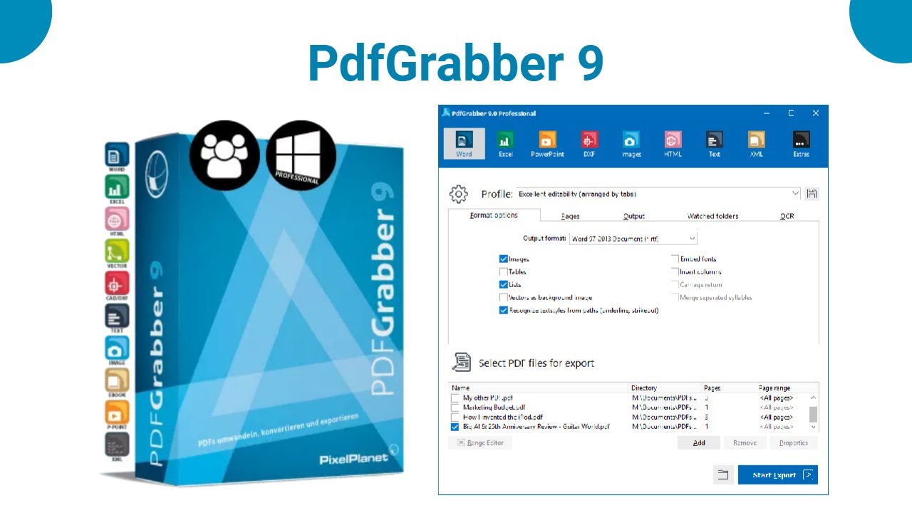 PdfGrabber Professional converts PDF documents to Microsoft Word and text, offers conversion options to images, HTML tables, and Microsoft Excel, and additionally includes export profiles to Microsoft PowerPoint, AutoCAD, and XML, as well as all automation options.